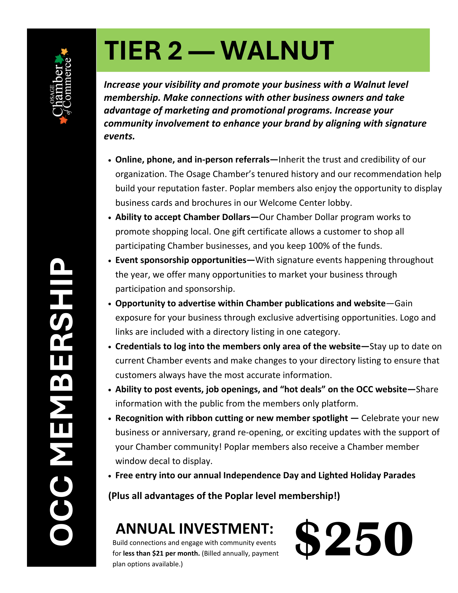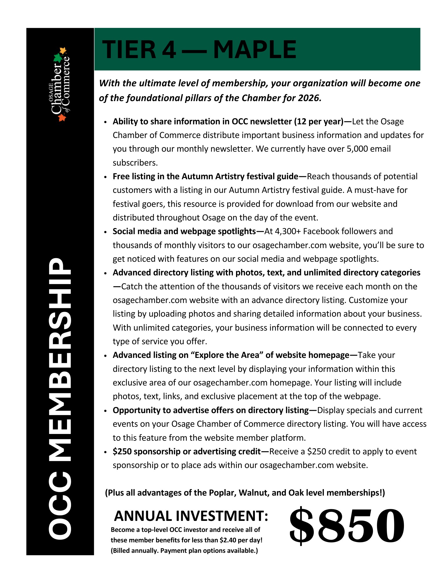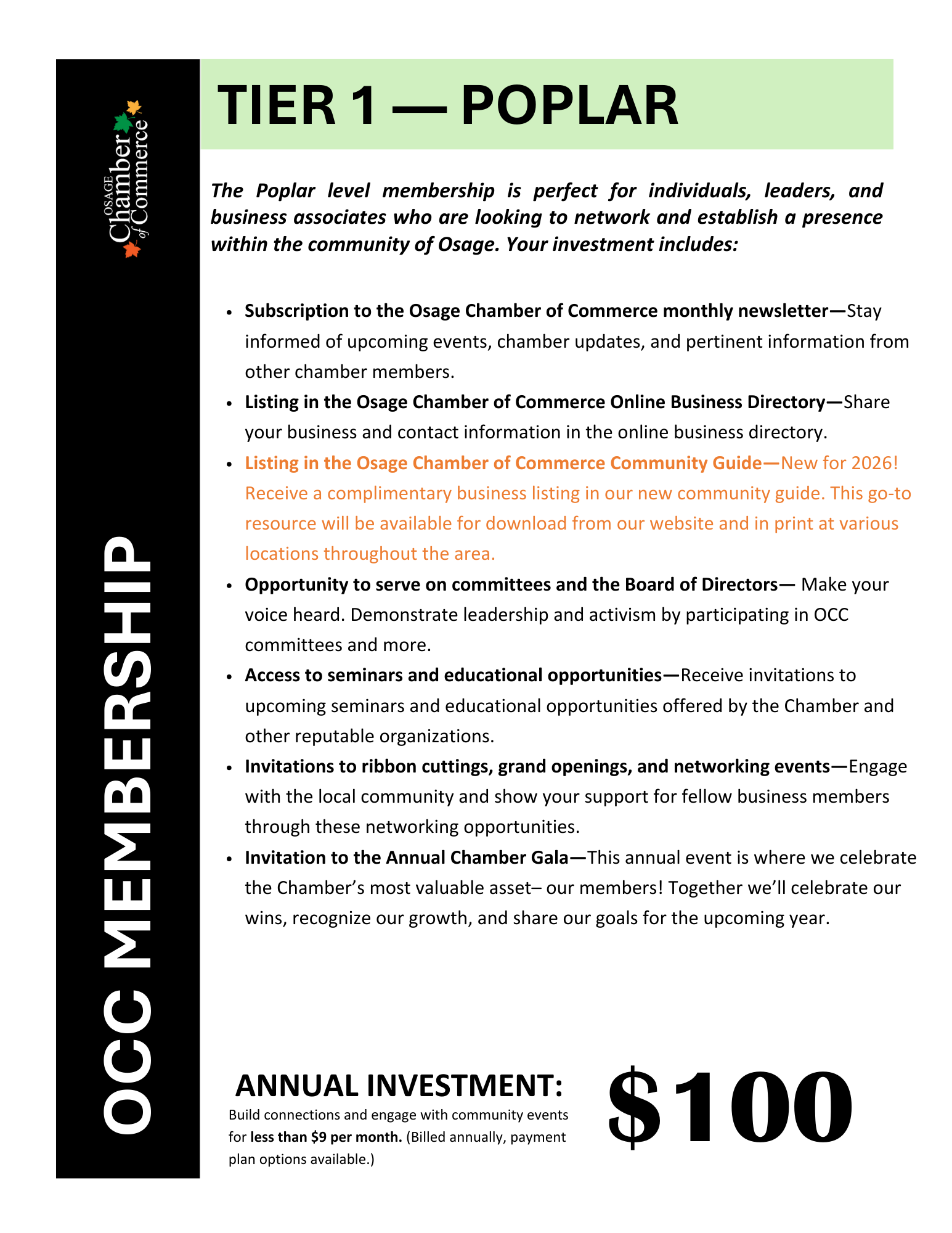 Thank you for your interest in 2026 OCC Membership! Choose your membership level below and follow the on-screen instructions to complete the application. You will be given the option to pay monthly, quarterly, semiannually, or in full. *Please note- if you wish to pay in installments, automatic payments will be required. The option to be invoiced is only included when paying in full.