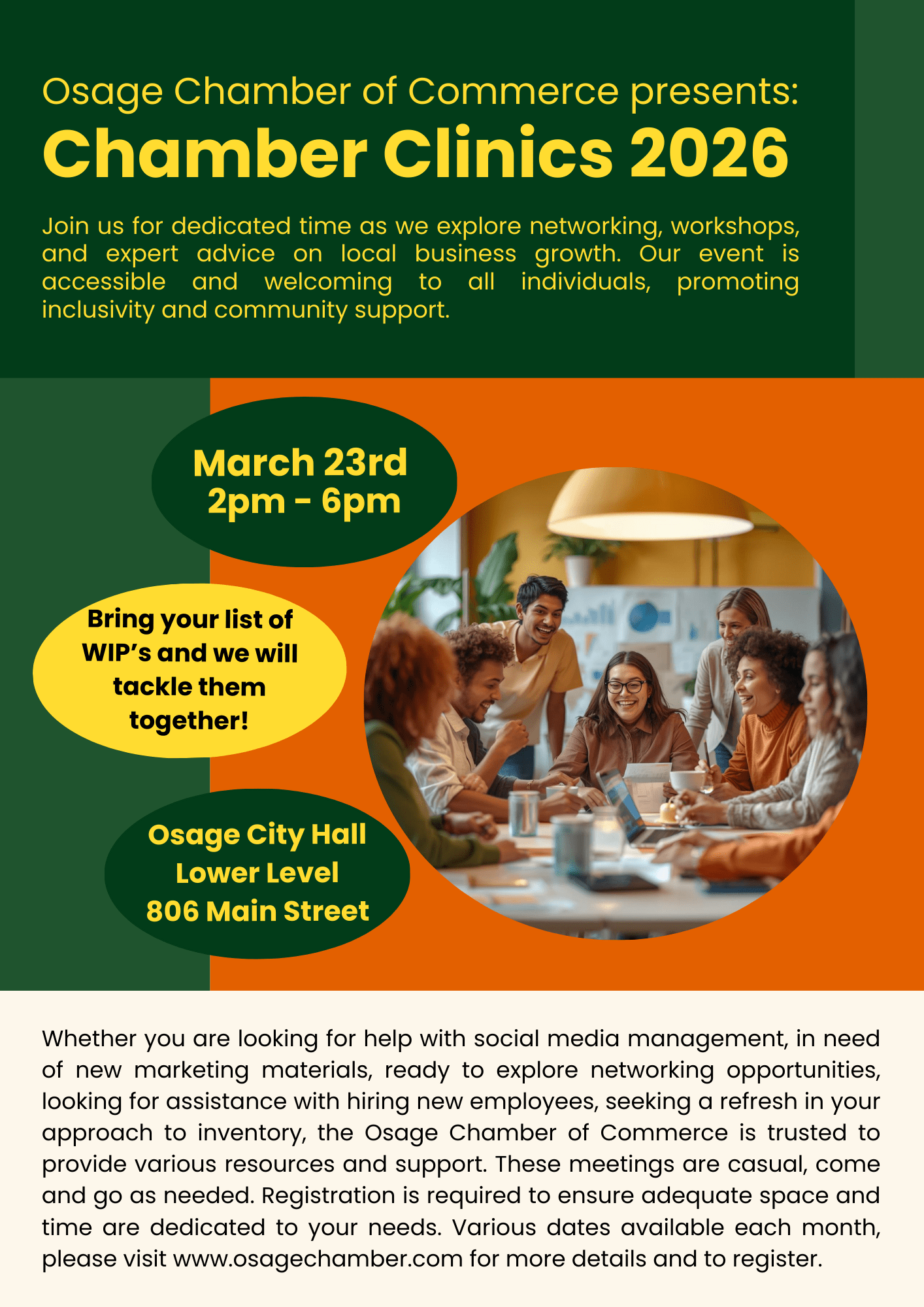 Whether you are looking for help with social media management, in need of new marketing materials, ready to explore networking opportunities, looking for assistance with hiring new employees, seeking a refresh in your approach to inventory, the Osage Chamber of Commerce is trusted to provide various resources and support. These meetings require registration to ensure adequate space and time are dedicated to your needs. Once you have registered, the Chamber will contact you to confirm your appointment time.Images