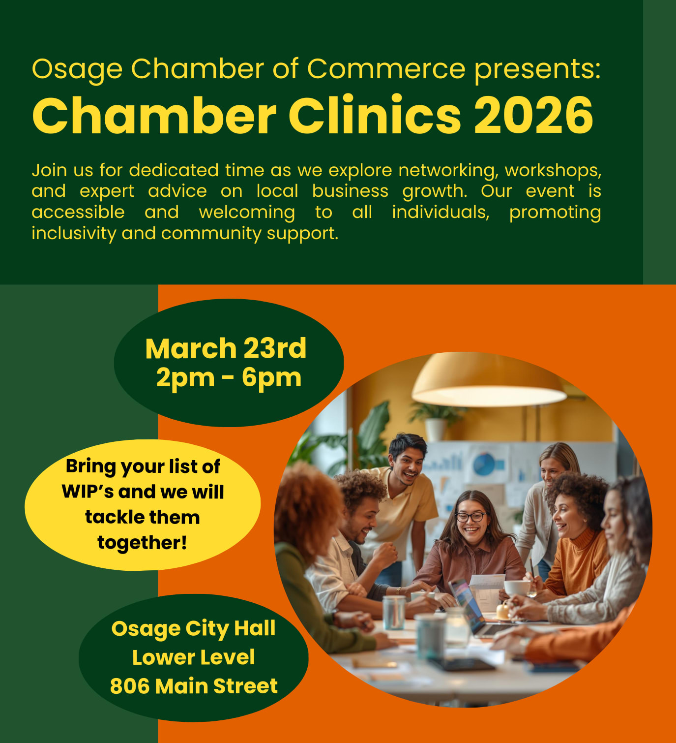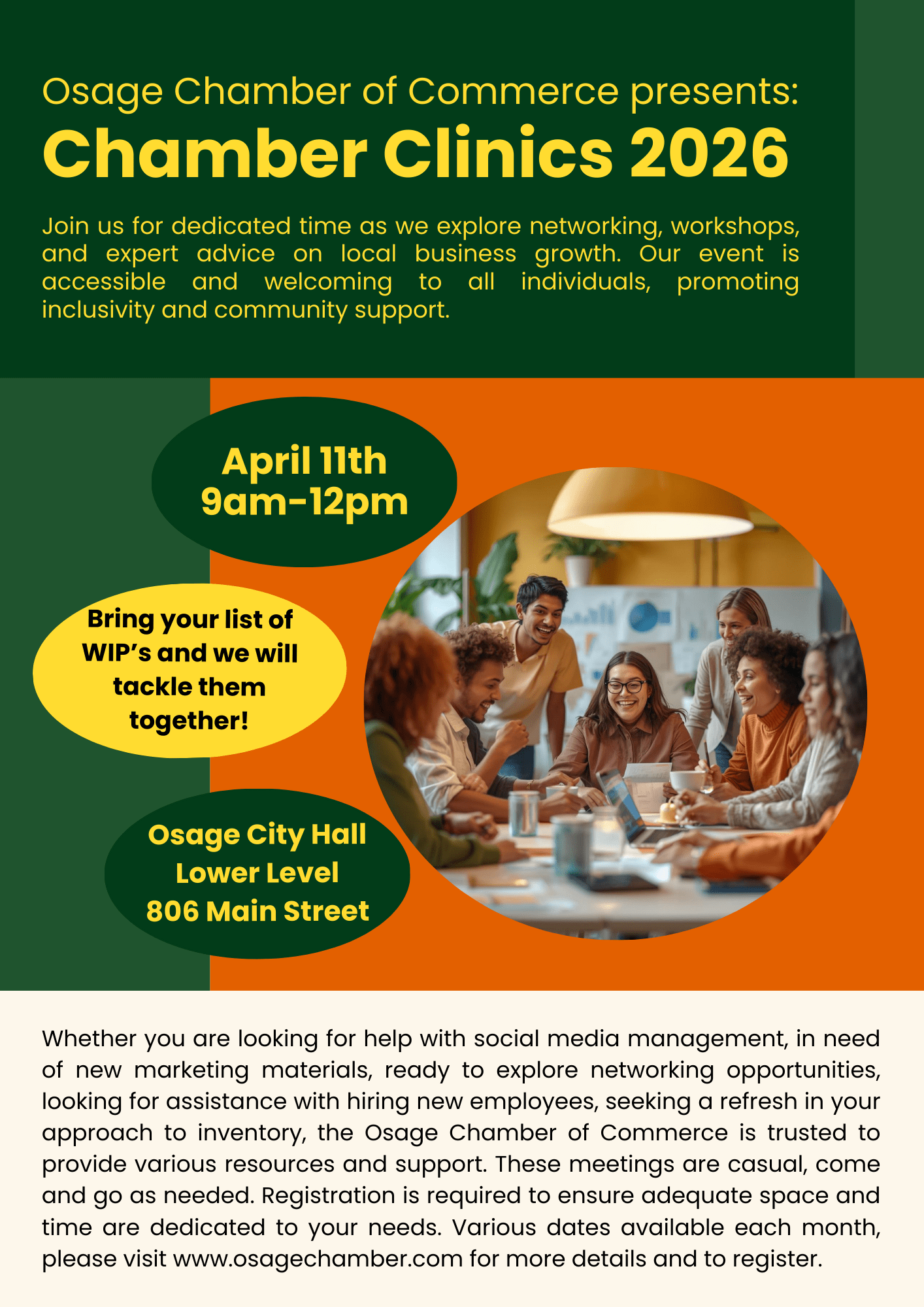 Appointments are booked by 30-minute sessions based on the needs of each client. Please message us directly with any time constraints we may have to accommodate at Director@osagechamber.com