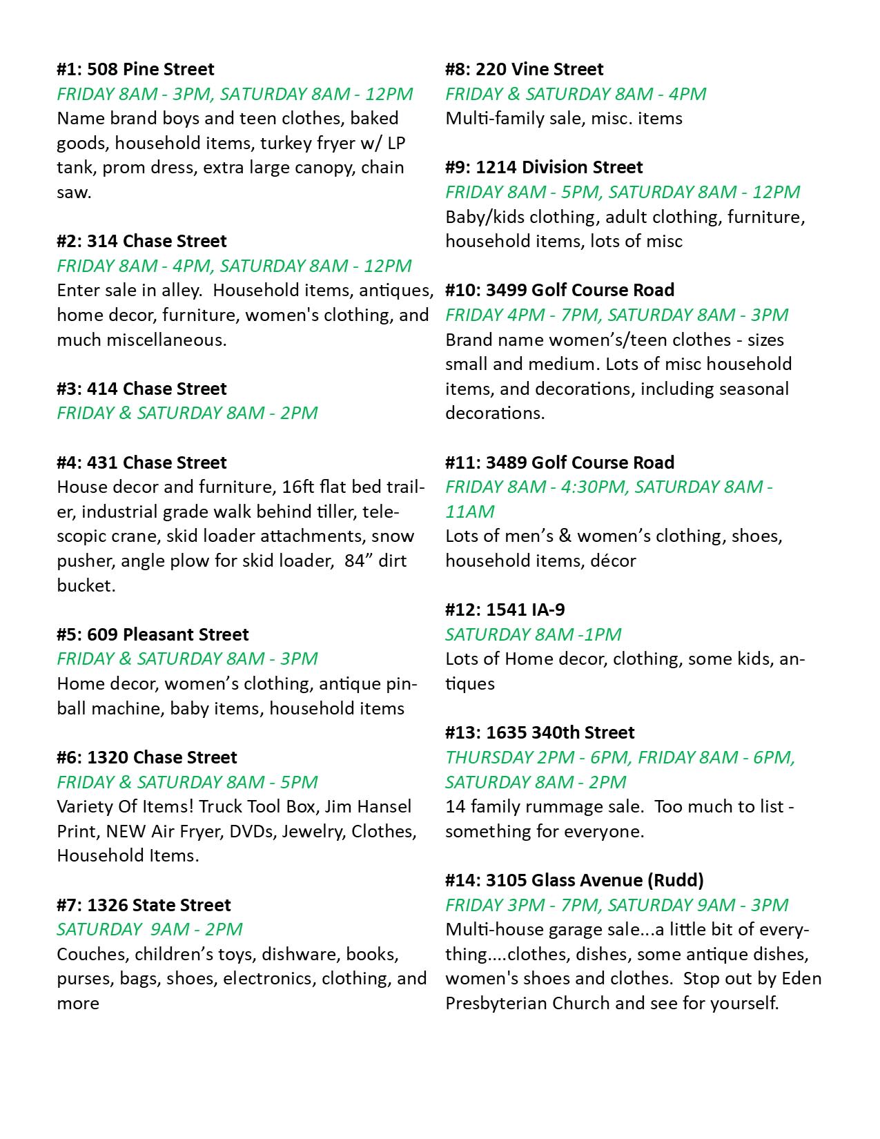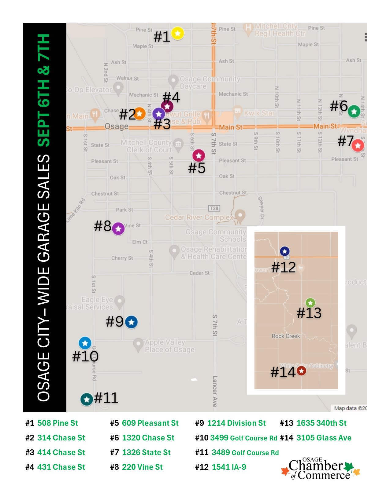The Osage Chamber of Commerce will offer a map of area sales - click the registration link to get listed. Please include a brief description of what kind of items your sale will offer. Maps will be available at Osage Chamber, Osage City Hall, and online. Deadline to be included is August 30th.