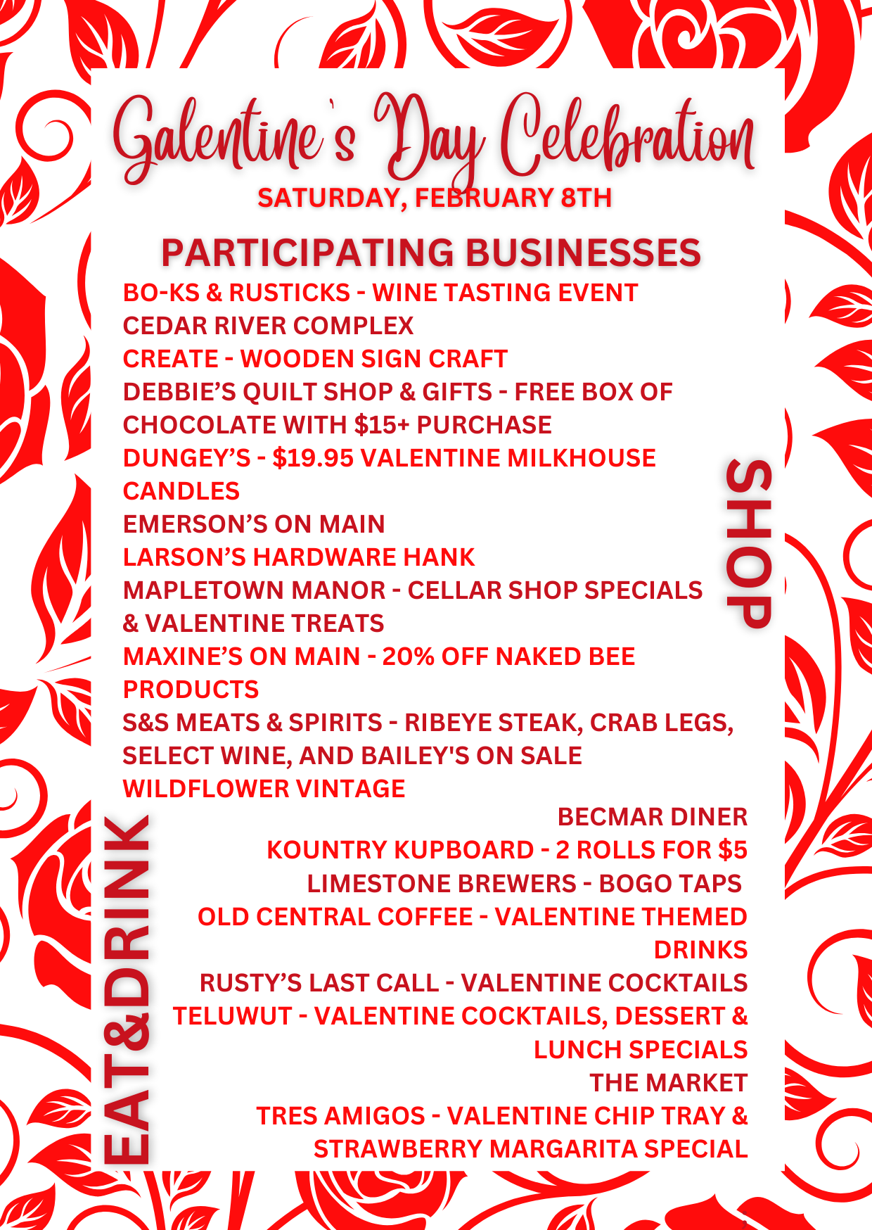 Grab your gal's and celebrate friendship during our Galentine's Day shopping event! Collect "love notes" from participating businesses with any purchase. Turn those love notes into the Chamber for chances to win a date-night gift package!